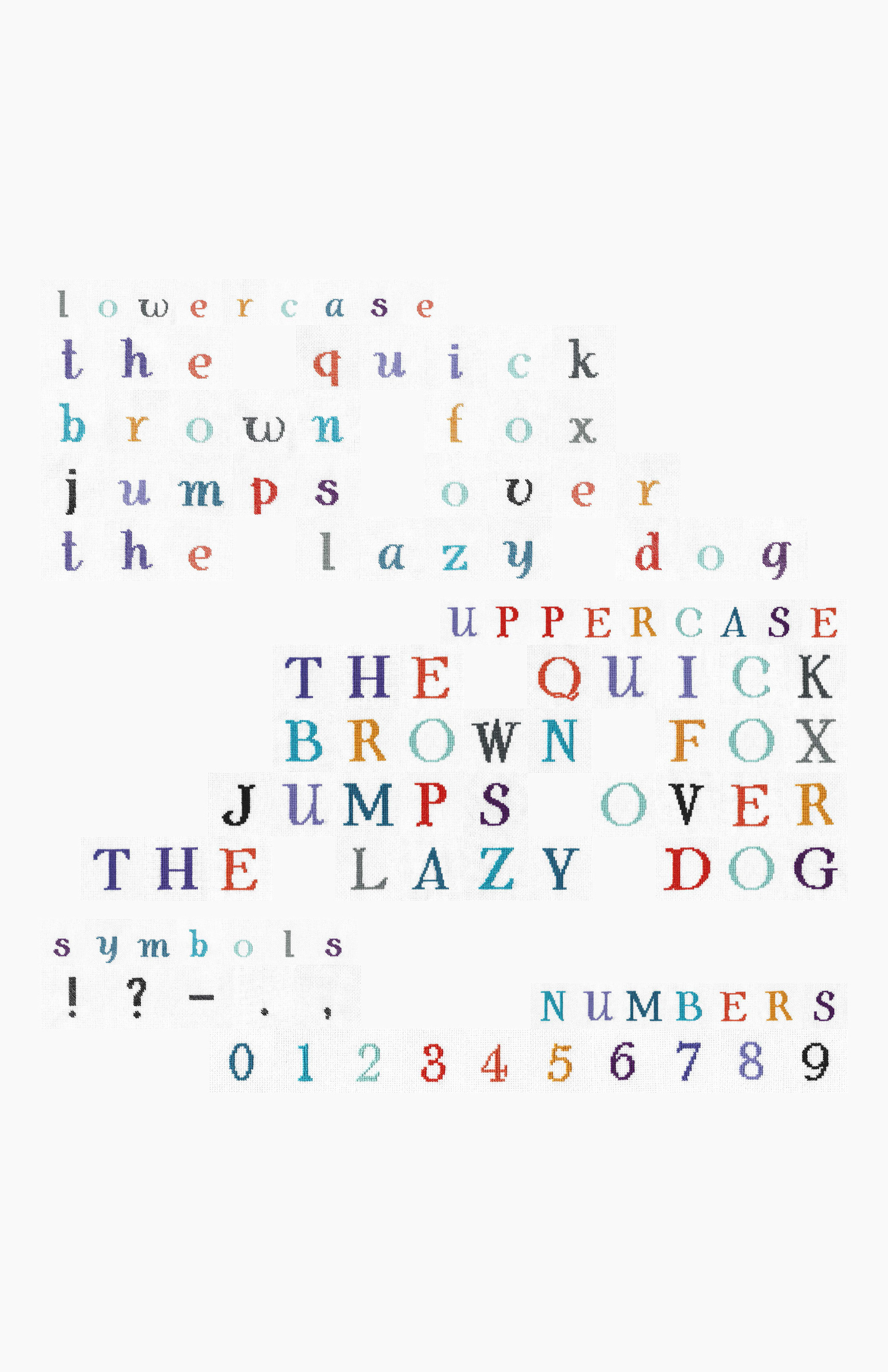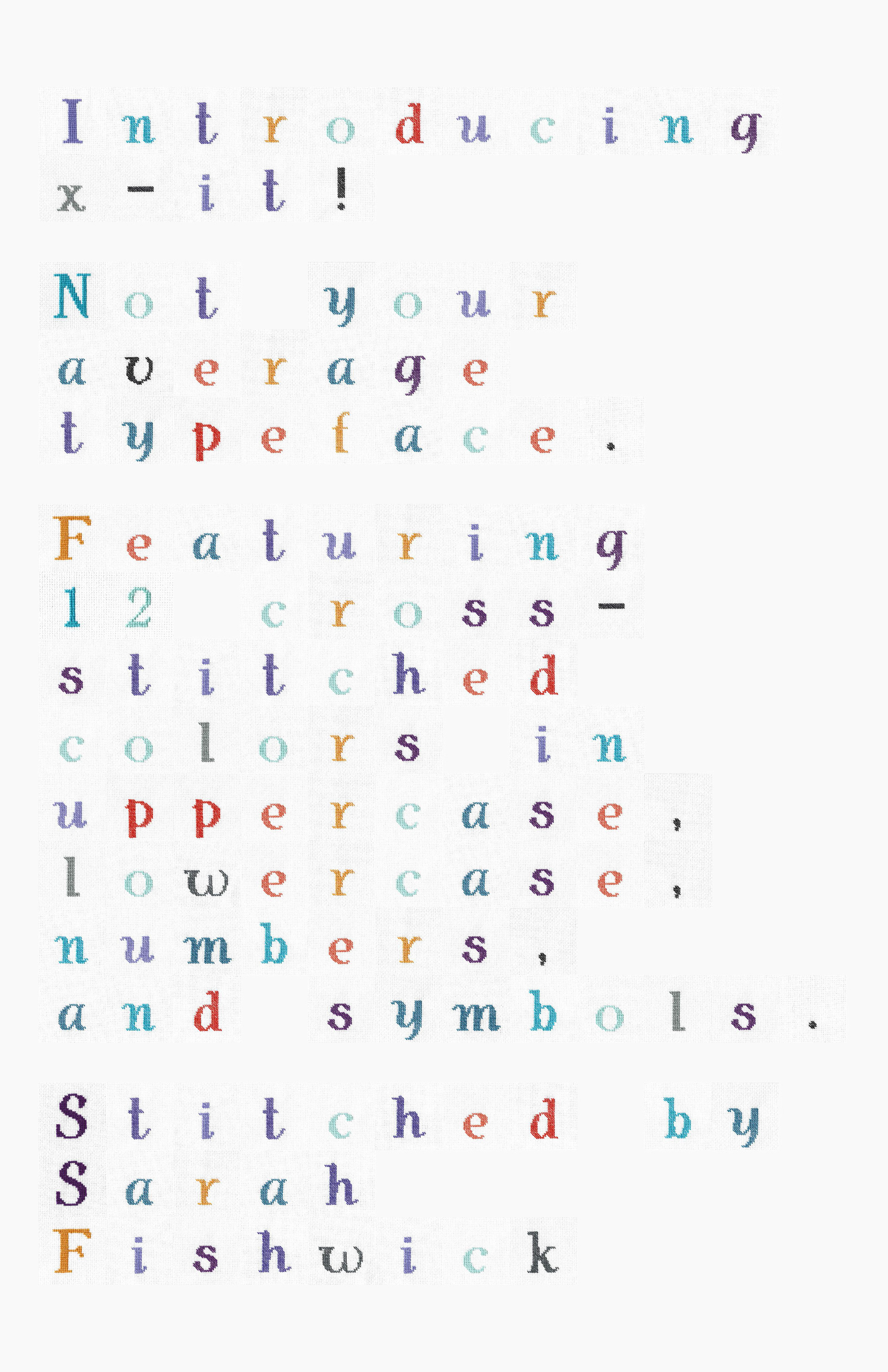 X-it is a cross-stitched typeface composed of 27 glyphs in 12 different colors.