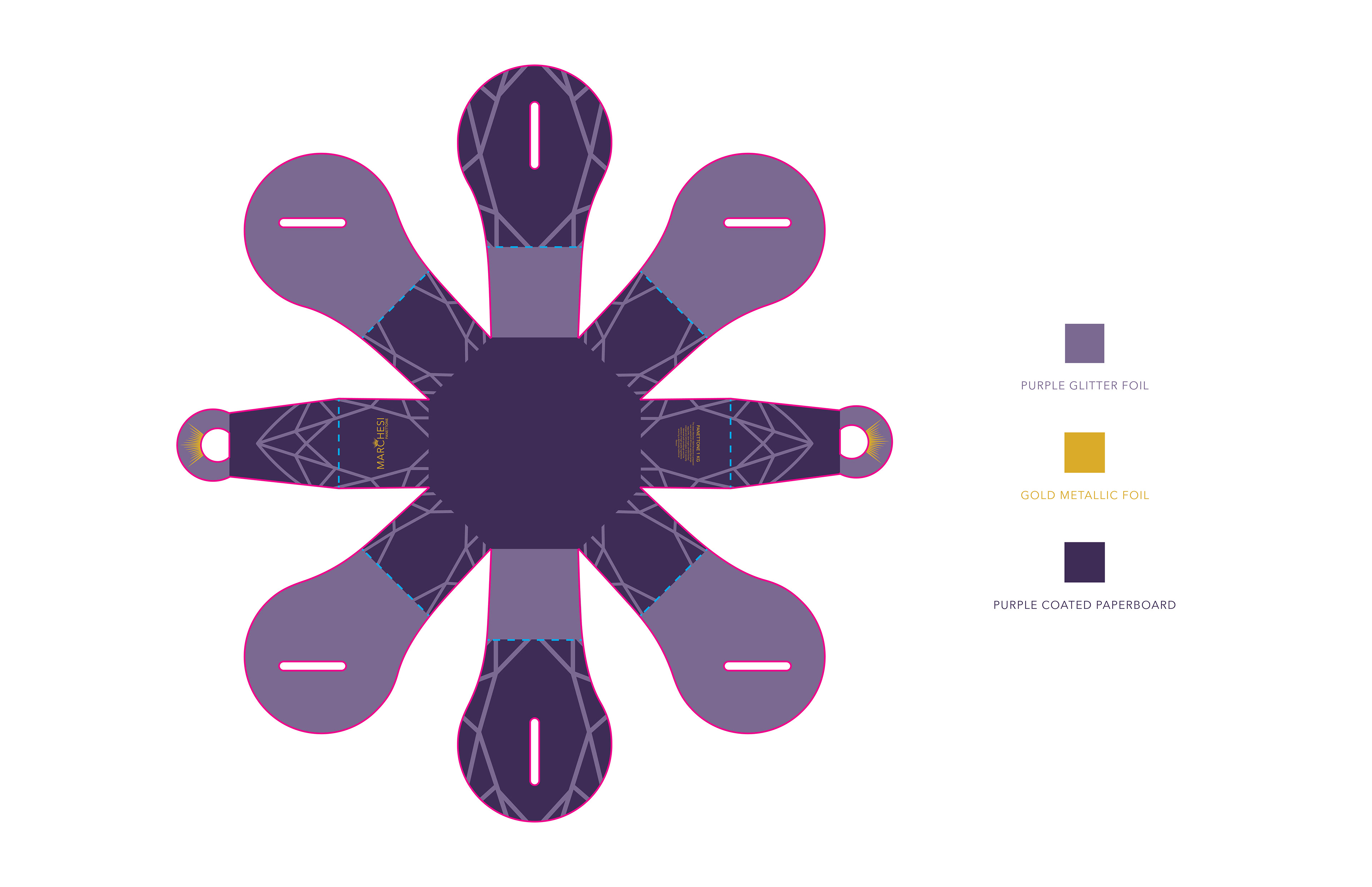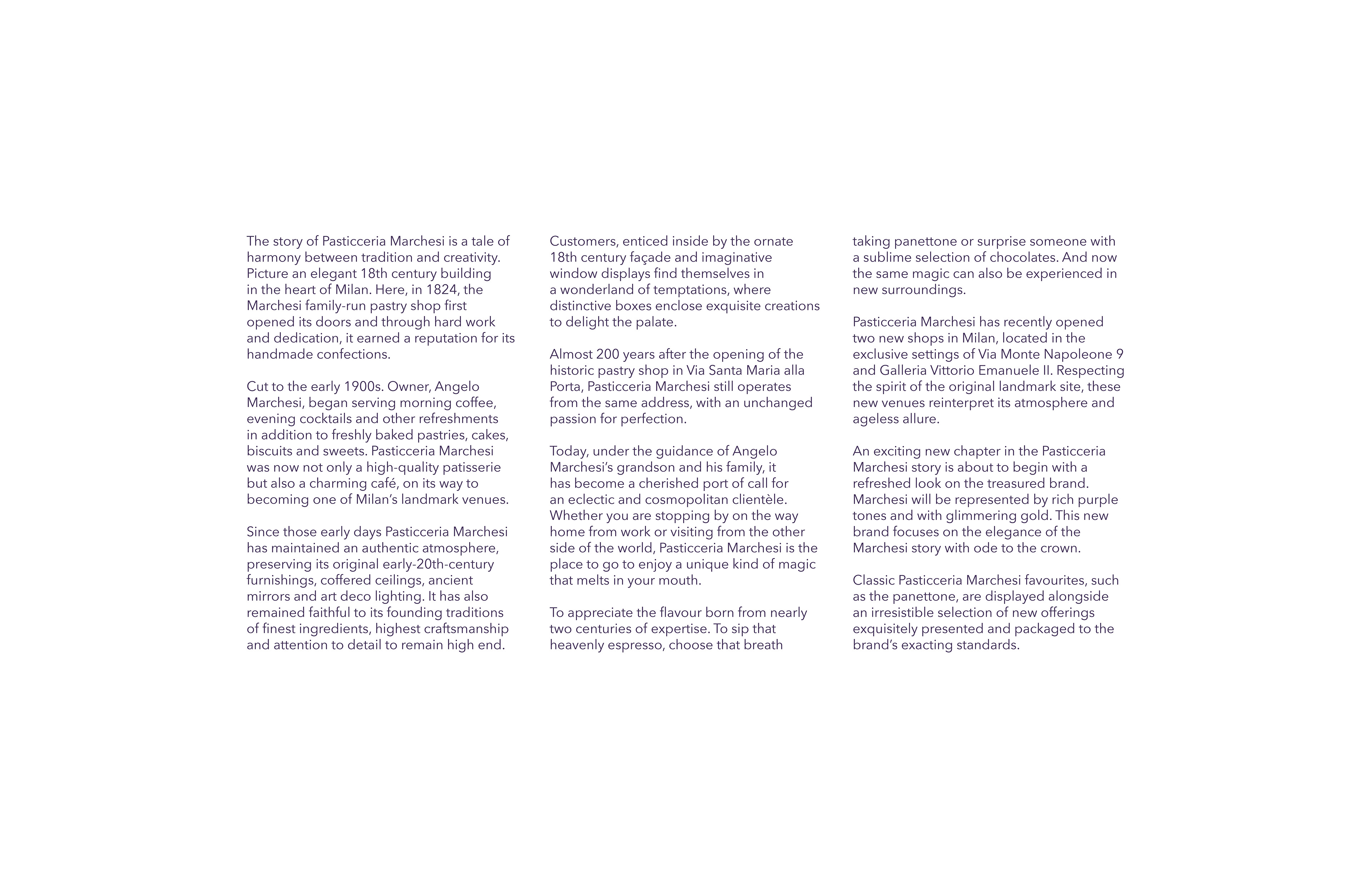 Marchesi is a classic Milan pasticceria beginning a new chapter with a refreshed look. The rich purple and gold tones focus on the elegance of Marchesi with an ode to the crown, while the new panettone packaging adds a unique but convenient twist.