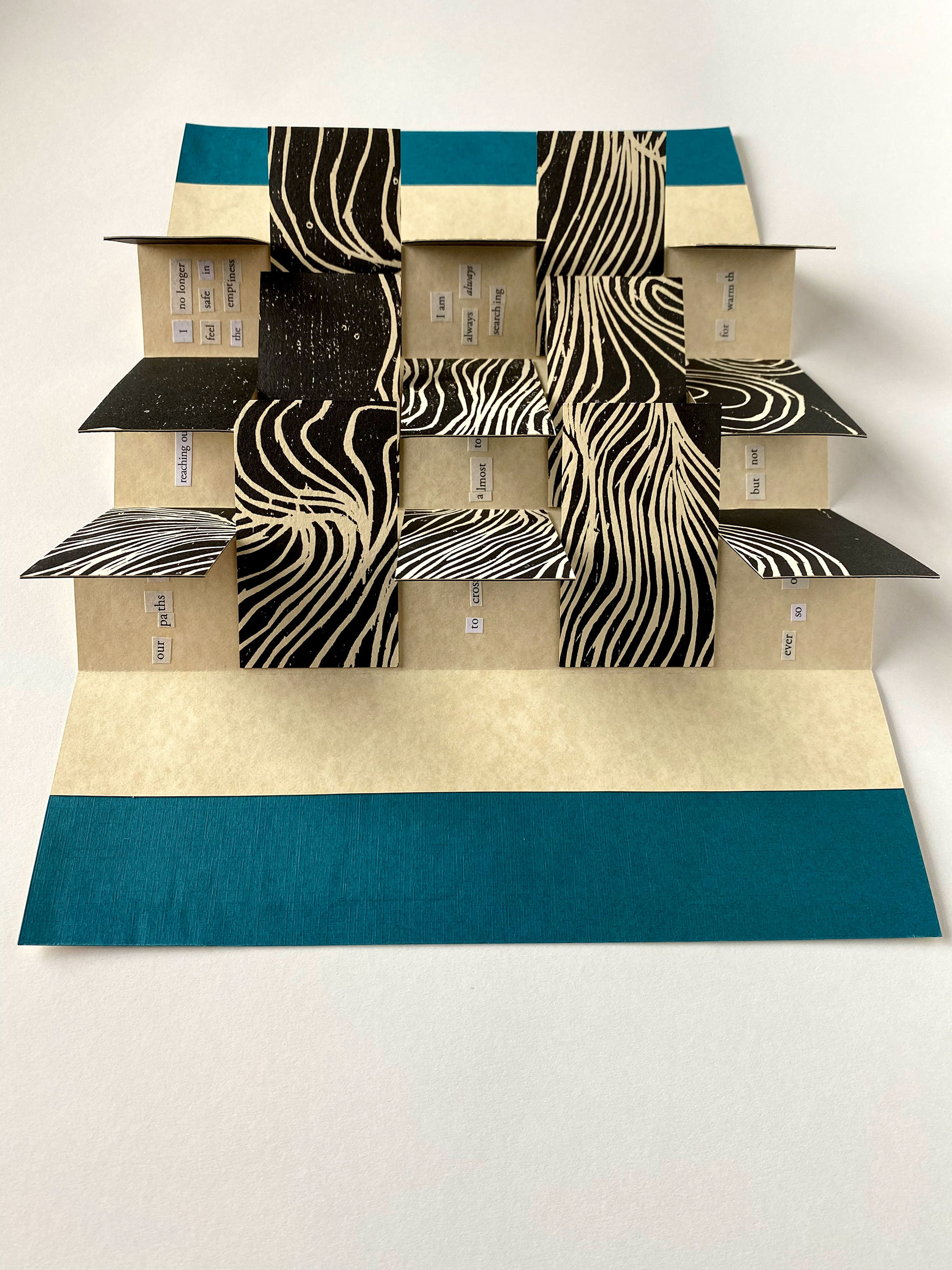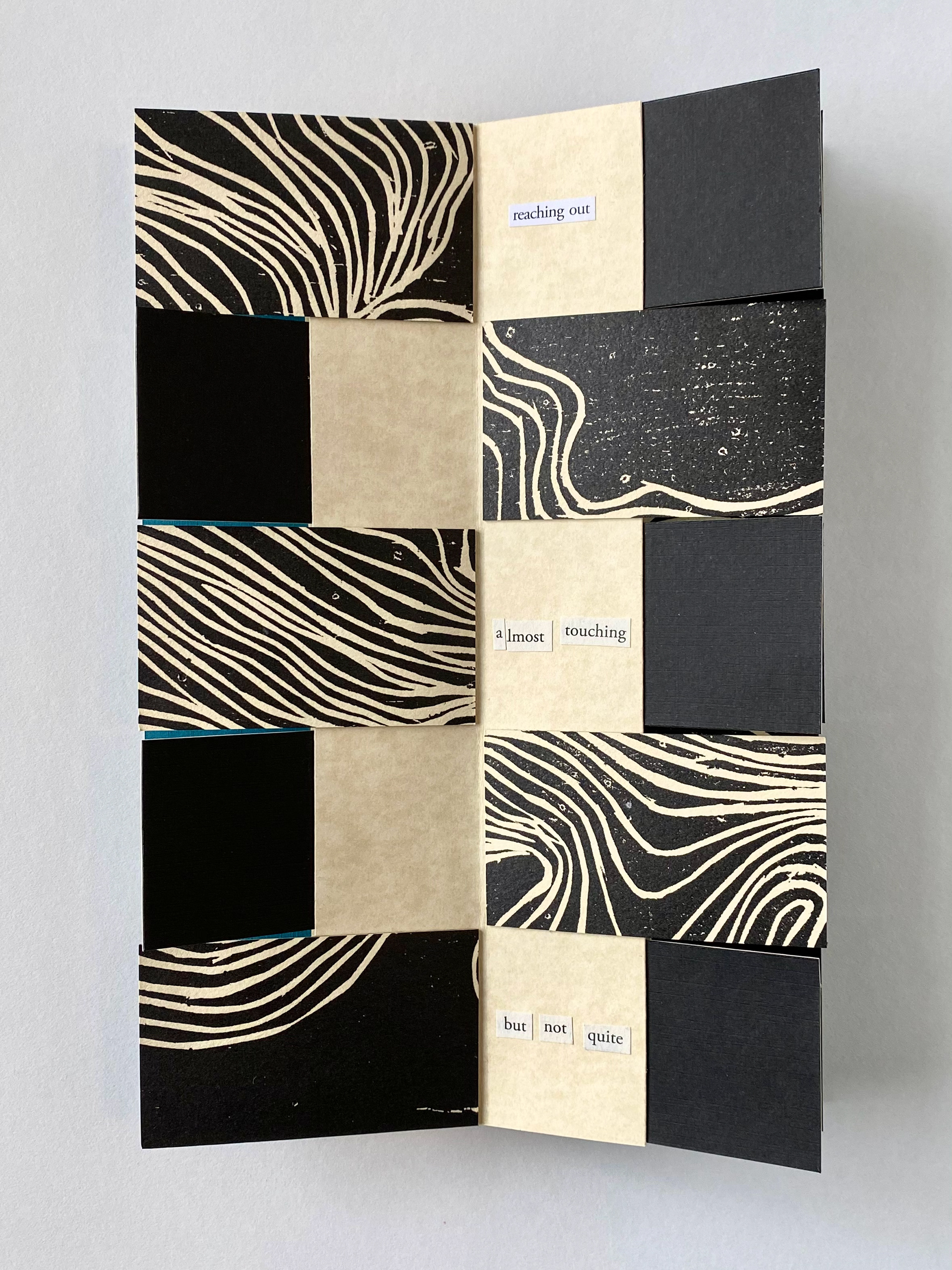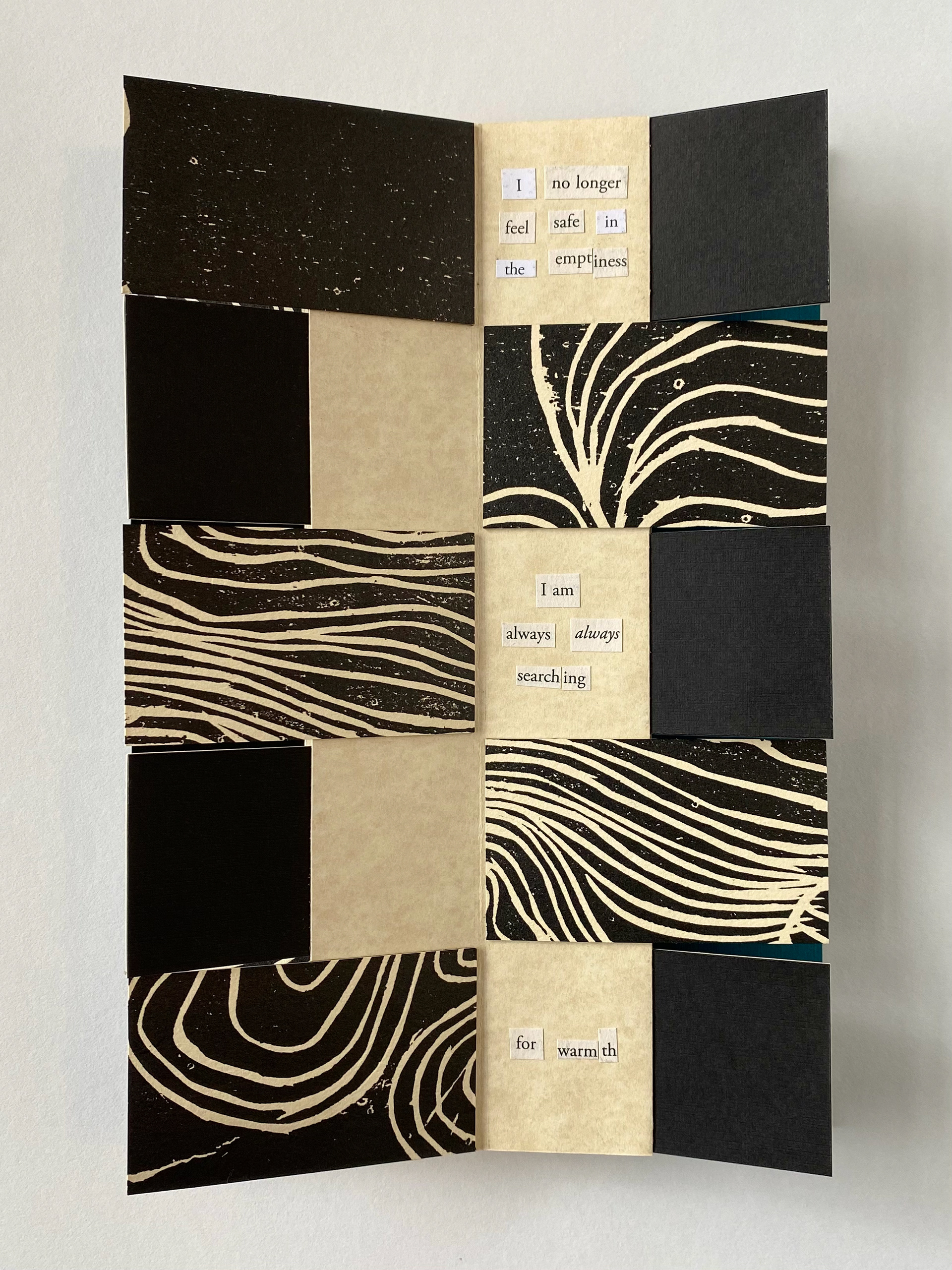 The Terrible Weight of Being is a hand-crafted flag book consisting of intaglio print and cut out poetry.