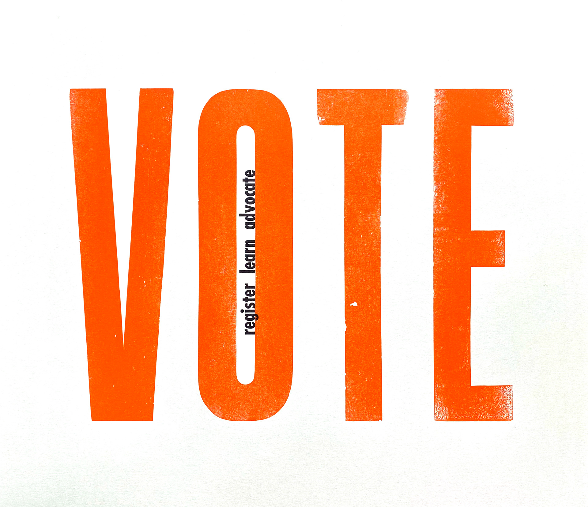 This 10in x 16in poster was printed with wood type at the Black Rock Press as a reminder to vote in the 2020 election.