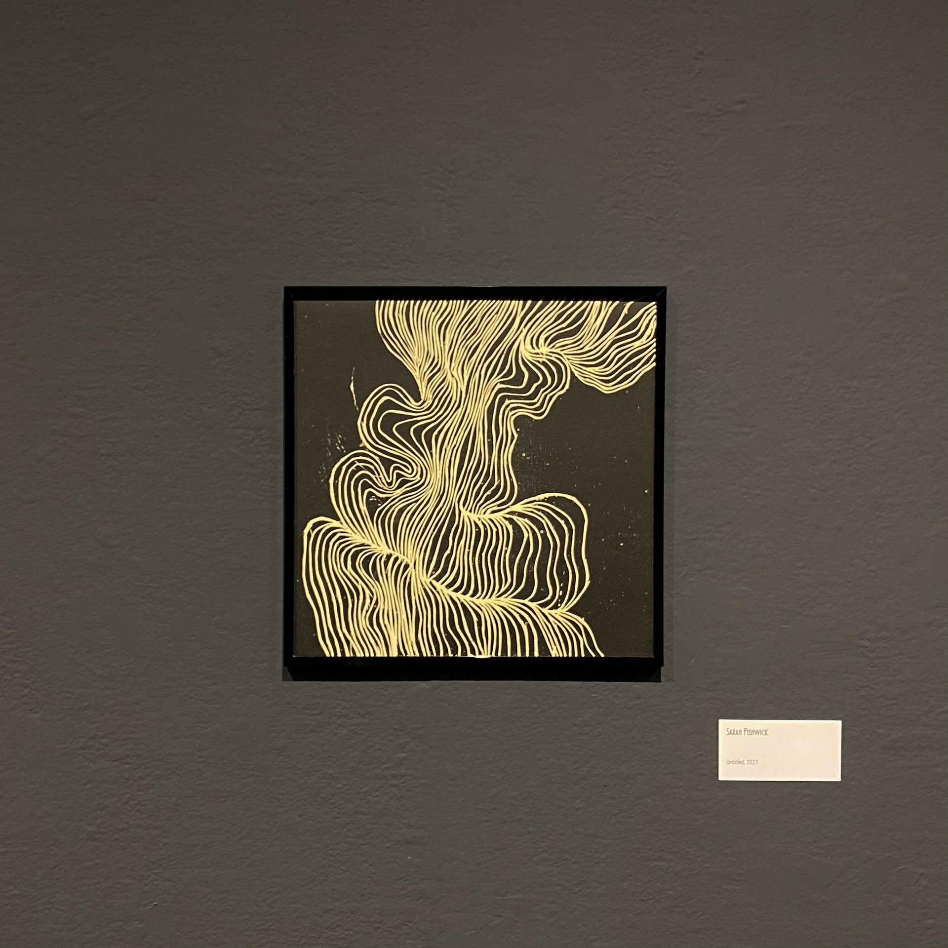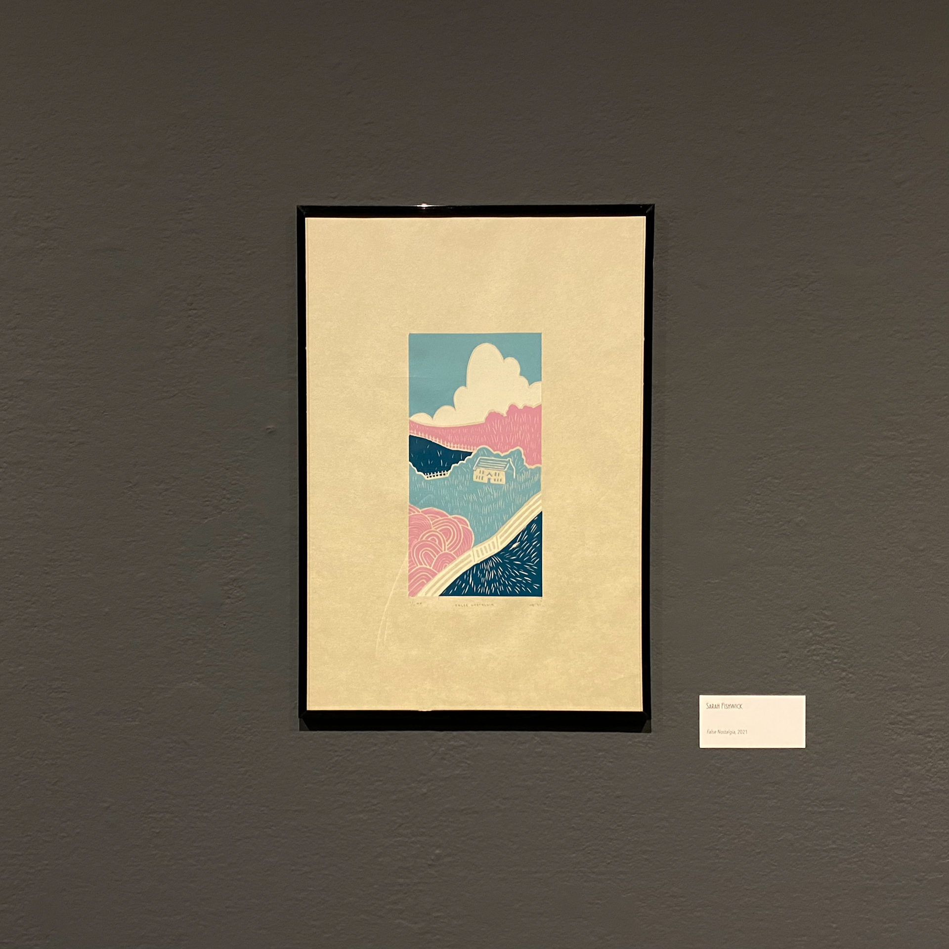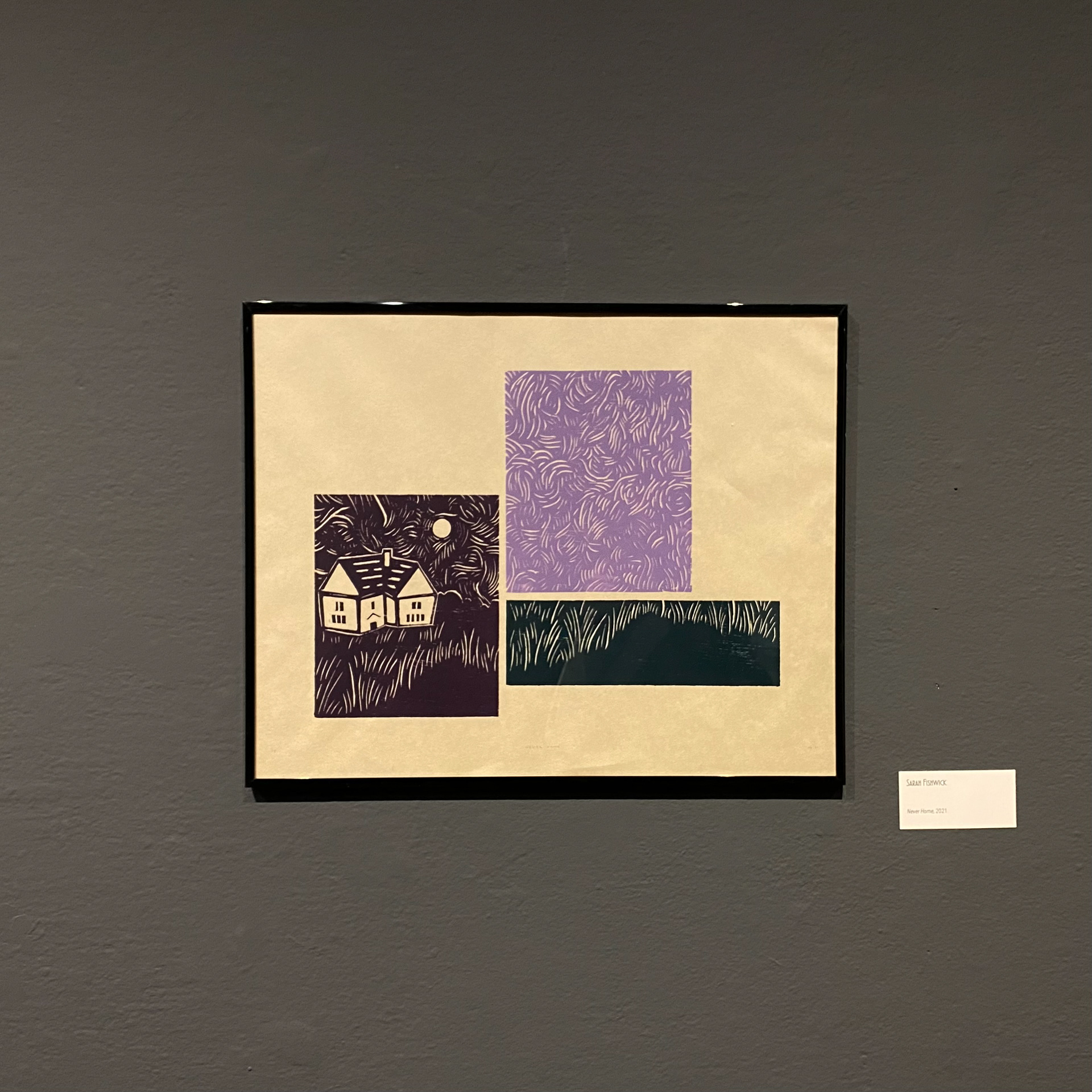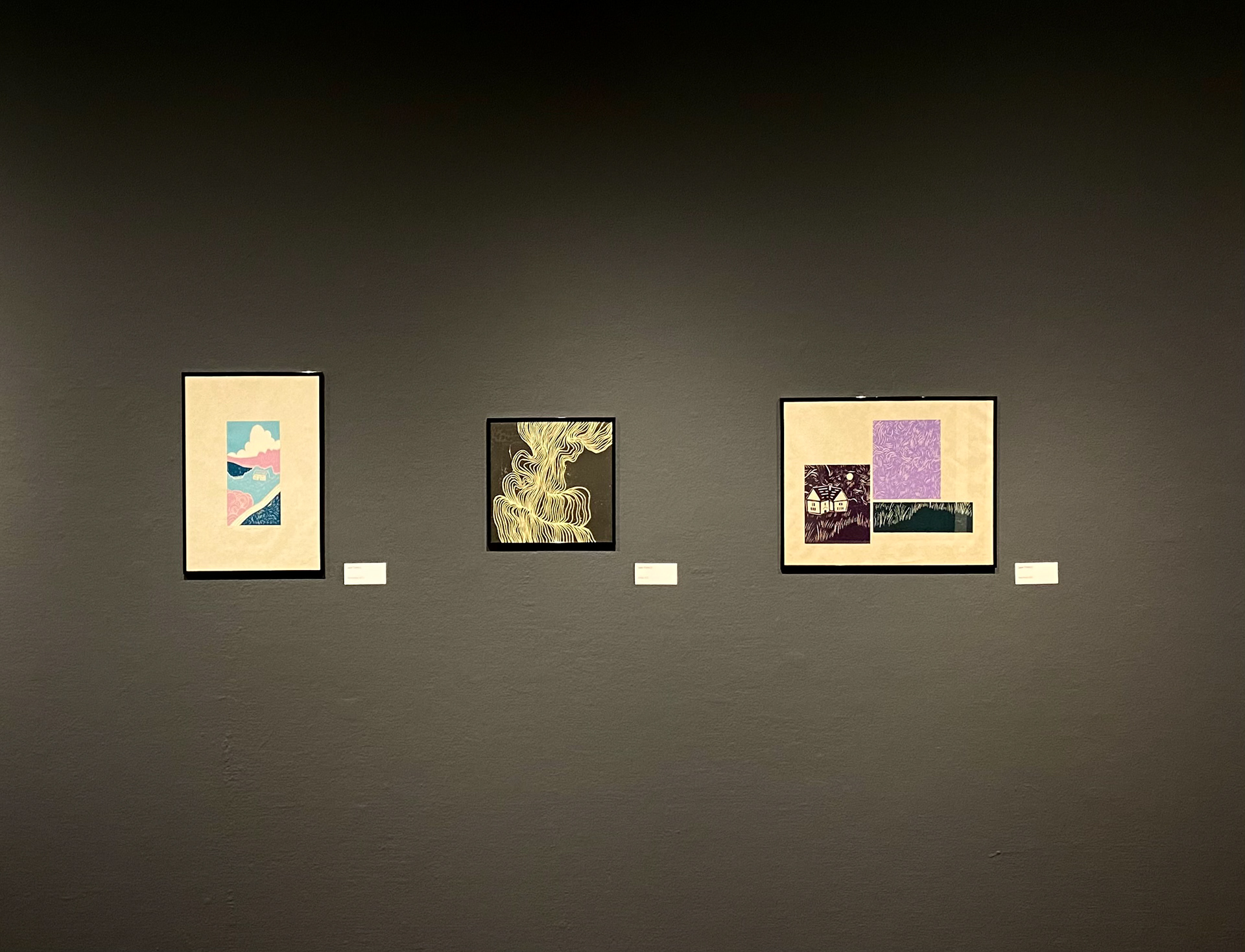 Three relief prints showcased in the World on Paper exhibition at the University of Nevada, Reno. Prints include False Nostalgia, Untitled, and Never Home.